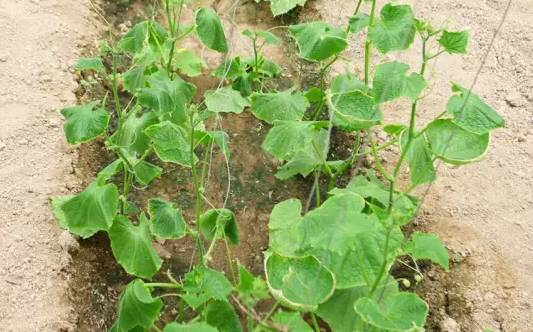 施肥的量和濃度一定要把握好。上圖就是由于底肥施用過量而導致黃瓜發生肥害,大面積萎蔫。葉面噴施時也要注意,高濃度的葉面肥會導致葉片細胞原生質失水,出現焦邊葉。