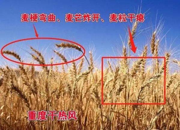 小麥灌漿時期,如遇到干熱風,對麥穗灌漿不利,會導致小麥整個植株會從上到下出現失水、青枯,籽粒干癟、千粒重下降,使小麥提前“枯熟”,導致小麥嚴重減產減產幅度5-10%左右。