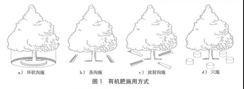 基肥可采用環狀溝施、條溝施放射溝施和穴施(圖1)以及地表覆蓋等方式進行局部集中施用。追肥可采用條溝施、放射溝施或管道施等方式進行。