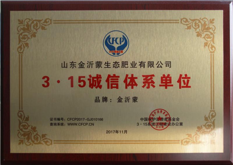 為貫徹落實黨和政府關(guān)于建立健全社會征信體系,褒揚誠信,懲戒失信和建立營造良好的法制環(huán)境,增強社會消費信心,根據(jù)新《消費者權(quán)益保護法》所賦予消費者組織的工作職能,中國保護消費者基金會決定推進3·15系統(tǒng)工程,發(fā)展維護消費者權(quán)益“3·15誠信體系單位”征信“放心消費(準入)品牌/產(chǎn)品”專題活動。經(jīng)過3·15系統(tǒng)工程建設(shè)辦公室嚴格地審核把關(guān),近日,山東金沂蒙生態(tài)肥業(yè)有限公司獲評為“3·15誠信體系單位”、金沂蒙肥料獲評為“3·15放心消費(準入)產(chǎn)品”。