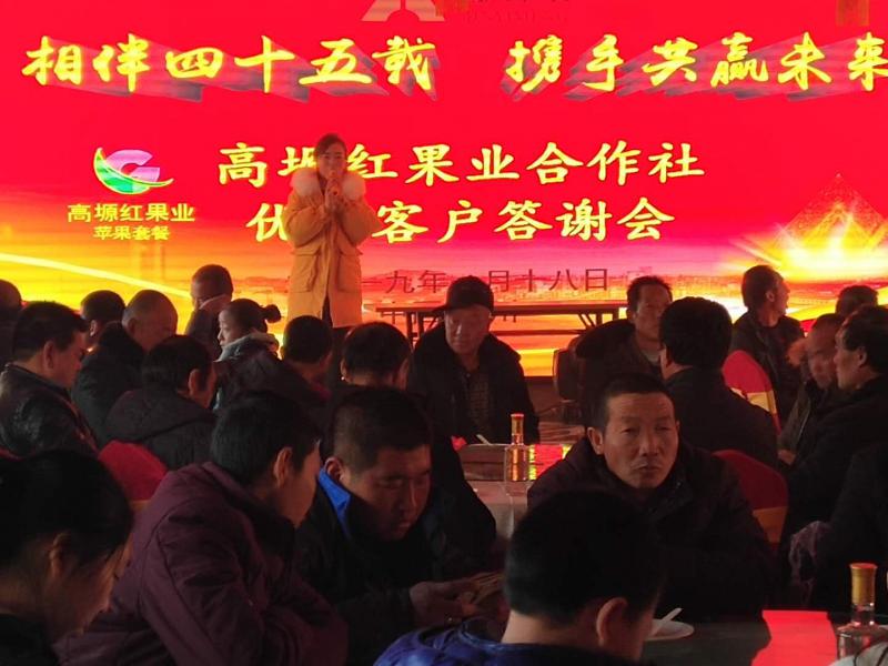 1月18日,陜西宜川的盛園大酒店內歡聲笑語,歌舞飛揚,高塬紅果業合作社的優秀客戶答謝會火熱進行,近300名果農歡聚一堂,交流種植心得,分享豐收喜悅。