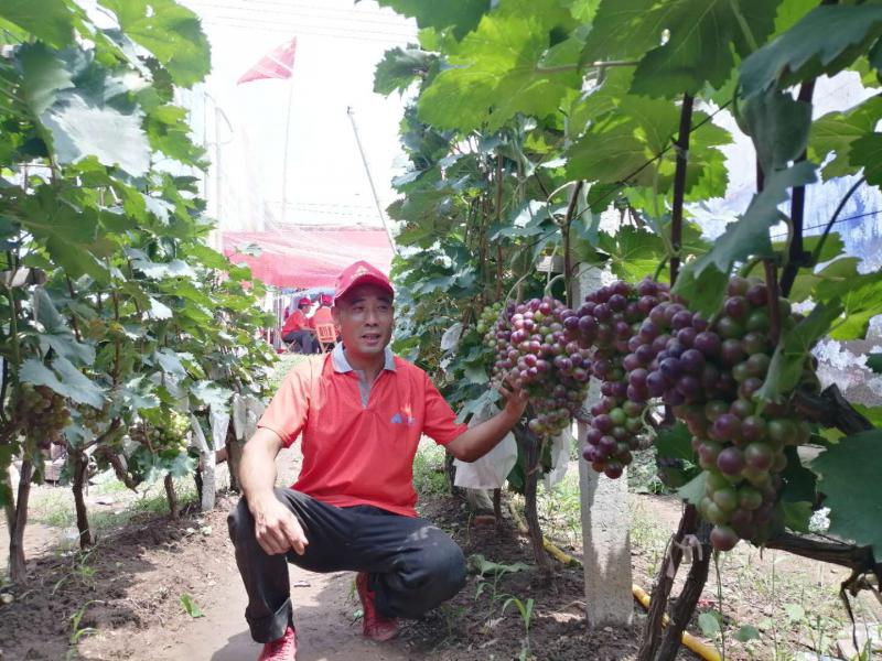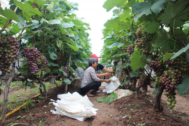 為了見證肥料效果,石宗保將孫夫金的葡萄園列為了示范田,并跟蹤記錄葡萄的長勢。按照石宗保的施肥方案,孫夫金的葡萄跟往年相比實現了大變樣,葉片濃綠,根莖粗壯,掛果率明顯提高。去年6畝地套了16000個袋,今年套了18000個,整整多了2000串葡萄!現在園里的葡萄即將迎來成熟季,拆開袋子一看,每串葡萄都在3斤以上,重的達到了五六斤!