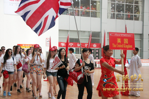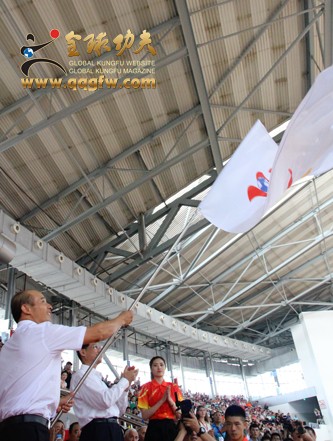 開幕式上,中國武協(xié)主席、國家體育總局武術(shù)運(yùn)動(dòng)管理中心主任高小軍先生向大會(huì)組委會(huì)主席傅彪先生授會(huì)旗。大會(huì)組委會(huì)主席傅彪向著名表演藝術(shù)家六小齡童頒授武交會(huì)形象大使證書。北京市體育局副局長苑振洲先生致歡迎詞,他代表組委會(huì)向運(yùn)動(dòng)員、教練員、裁判員、全體來賓和新聞媒體表示熱烈歡迎,向支持武術(shù)發(fā)展的社會(huì)各界人士表示真摯的感謝。他說,“2014北京國際武術(shù)文化交流大會(huì)是在前三屆武交會(huì)的基礎(chǔ)上舉辦的,本屆大會(huì)從賽事組織上更加規(guī)范,賽事規(guī)模上更加宏大,為來自世界各國與地區(qū)的武術(shù)愛好者們提供展示精彩武藝的平臺(tái)。”國際功夫聯(lián)合會(huì)副主席兼歐洲功夫聯(lián)合會(huì)主席尼克來先生代表國際友人致辭,他代表歐洲功夫聯(lián)合會(huì)以及全體參賽的國外代表隊(duì)對(duì)本次大會(huì)表示熱烈祝賀,希望通過這次大會(huì),增進(jìn)對(duì)中國武術(shù)的了解,促進(jìn)各國武術(shù)界與中國武術(shù)界的交流。