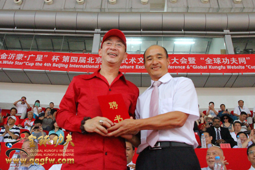 聯(lián)合國友好使者、中國武協(xié)副主席、國際功夫聯(lián)合會(huì)主席、北京國際武術(shù)文化交流大會(huì)組委會(huì)主席傅彪先生向六小齡童頒發(fā)武交會(huì)形象大使證書。